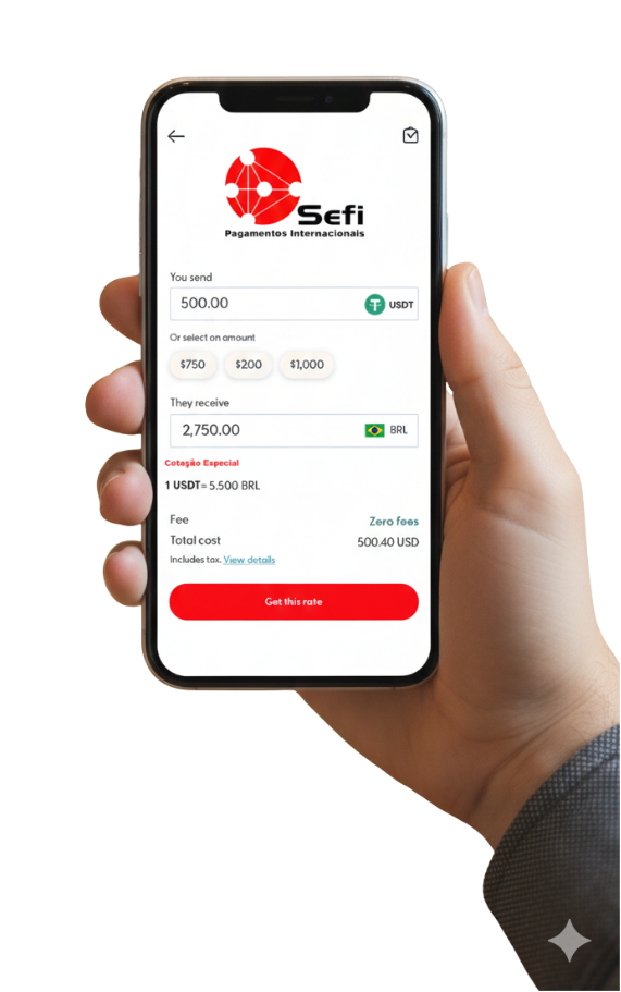 A Sefi oferece uma solução moderna para enviar recursos ao exterior e realizar pagamentos internacionais com segurança, rapidez e total previsibilidade. A plataforma integra FIAT e stablecoins em um único ambiente, permitindo que o cliente escolha o formato mais eficiente para cada operação.